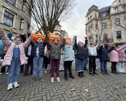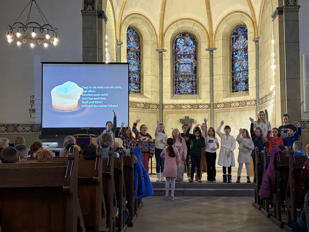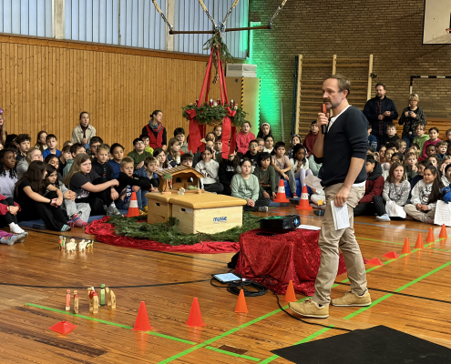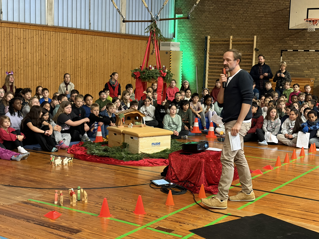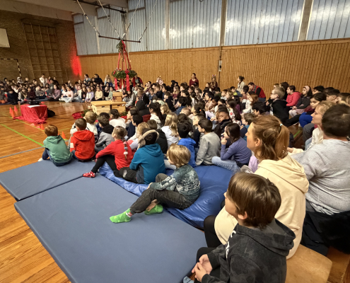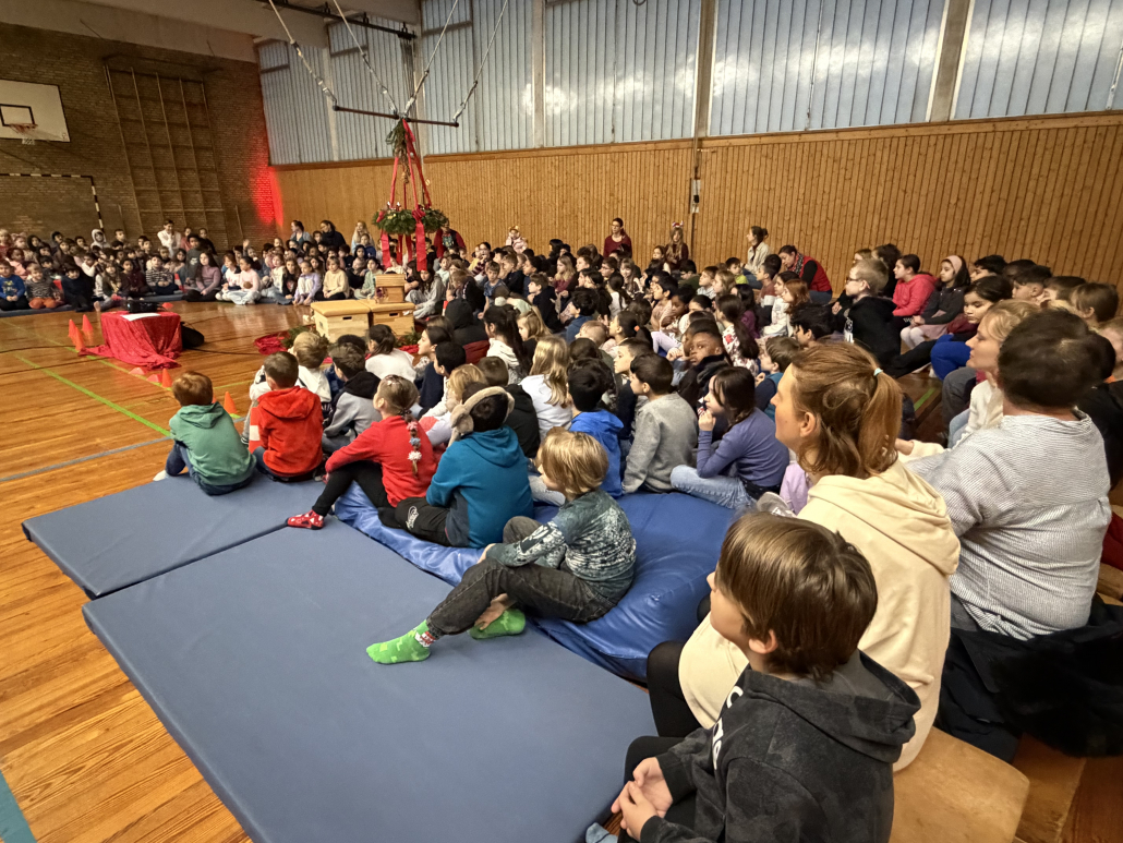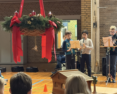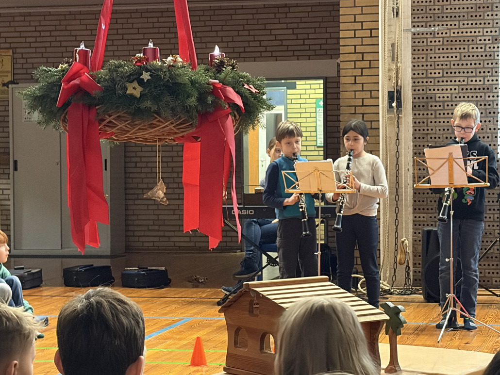 Eine schöne Tradition sind unsere gemeinsamen Adventsfeiern in der Turnhalle. Jeder Jahrgang denkt sich einen besonderen Beitrag aus. In diesem Jahr gab es Geschichten, einen fröhlichen Schneeflockentanz und auch der Chor und die Jekits-Klarinetten-Kinder hatten etwas eingeübt.