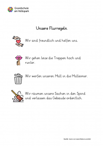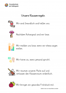 Gemeinsam mit den Schülerinnen und Schülern haben wir Regeln vereinbart, die wir in unserem Schulalltag leben. Diese gelten am Vormittag sowie am Nachmittag. Gemeinsam achten wir darauf, dass sie eingehalten werden.